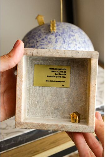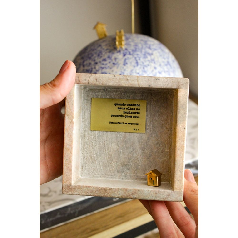 O quadro decorativo horizontes internos I, é uma peça requintada que une arte e poesia, obra sofisticada em detalhes, composta pela rocha pedra de sabão, que apresenta a miniatura de uma bela casinha dourada, sob a placa metálica gravada com a poética frase (Quando caminho meus olhos no horizonte recordo quem sou – como é fácil se esquecer), todos os detalhes em dourado são banhados a ouro. Obra artística que reflete poesia, uma combinação de elegância, a peça ideal para pendurar na parede em espaços que valorizam a arte.