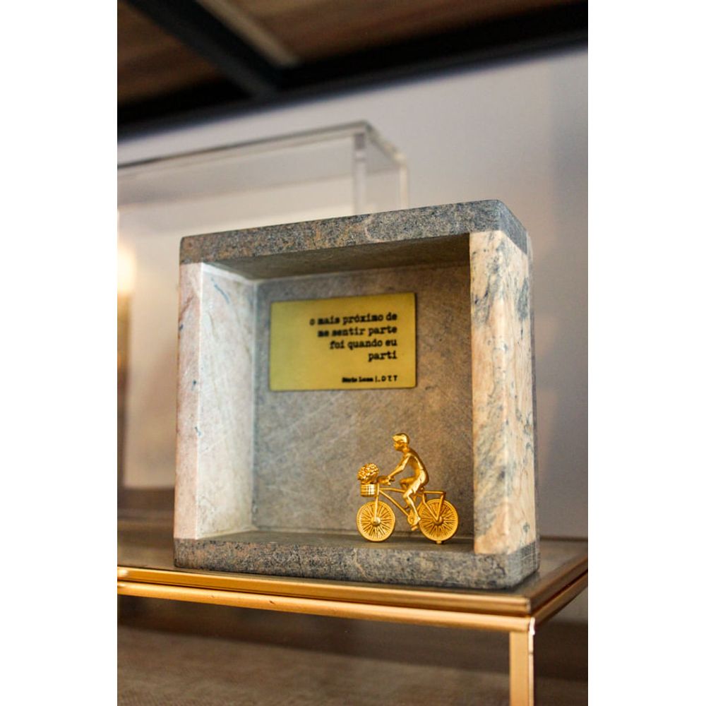 O quadro decorativo sobre os tempos I, é uma requintada peça que une arte e poesia, obra sofisticada em detalhes, composta pela rocha pedra de sabão, que apresenta a miniatura de uma figura na bicicleta levando flores no cestinho, sob a placa metálica gravada com a frase (O mais próximo de me sentir parte foi quando eu parti), todos os detalhes em dourado são banhados a ouro. Uma obra que reflete poesia e uma reflexão sobre o tempo e pertencimento, uma combinação de elegância, a peça ideal para pendurar na parede em espaços que valorizam a arte.