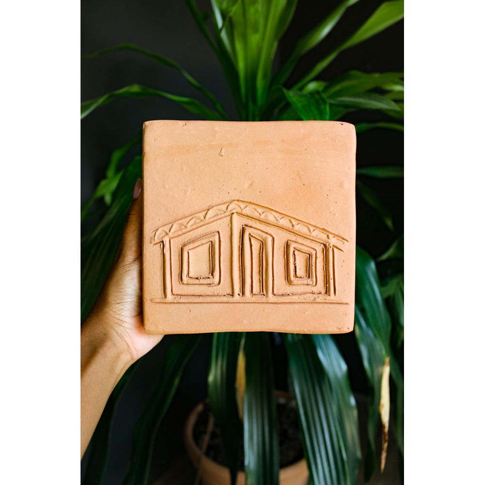 Escultura decorativa feita de barro em formato de tijolinho, com o design central de uma casinha.