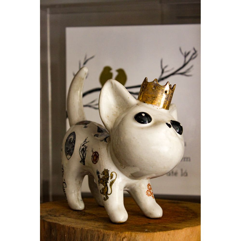 Toy decorativo inked miau king feito em cerâmica em formato de gatinho, com figuras delicadamente aplicadas em suas costas transformando-o em um gatinho tatuado. Neste modelo ele possui uma coroa dourada simbolizando o charme e realeza do felino, na patinha traseira a frase (God save the queen) traduzido em: Deus salve a rainha, em seu nariz um sutil coração em cor preto, Para completar a experiência, cada gatinho vem com sua própria casinha: uma caixinha personalizada super fofa que conta a história da tatuagem.
