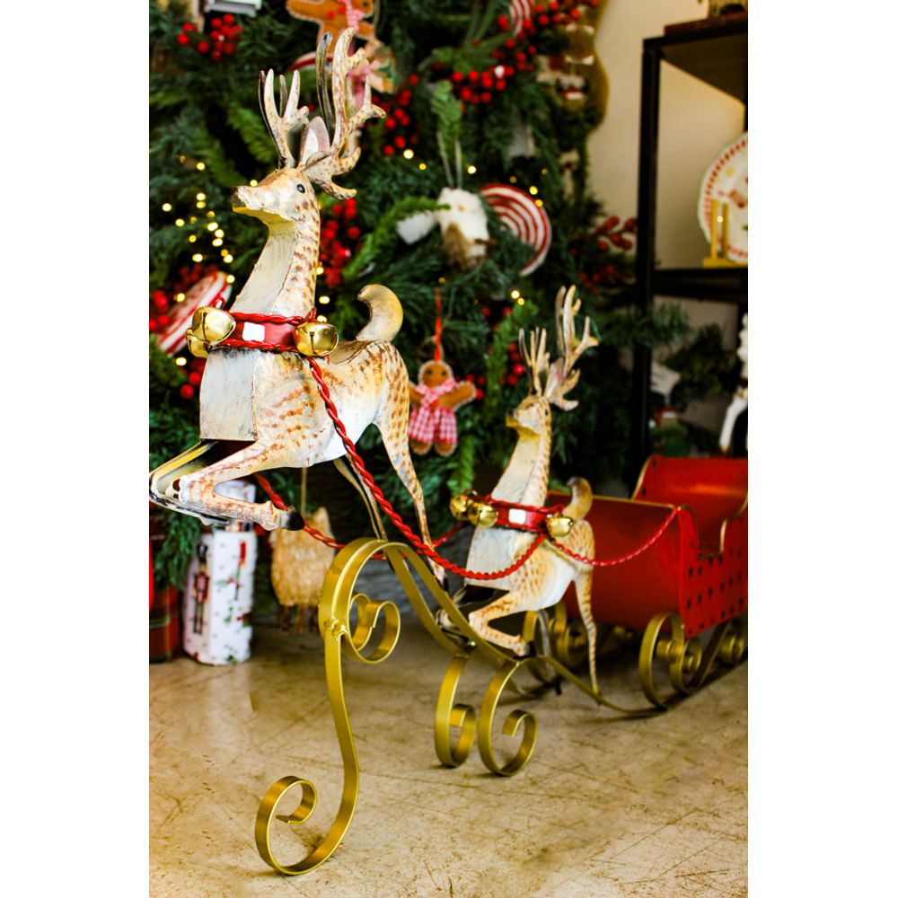 O trenó com rena é uma peça clássica de natal que vai somar em sua decoração, com duas renas com pinturas de efeito realista, e pequenos sinos dourados em sua rédea vermelha e trançada em metal, levando um delicado carrinho vermelho com algumas formas de estrelas vazadas e detalhes dourados que adicionam brilho para a peça, a decoração ideal para você inserir presentes dentro ou o que desejar, a peça perfeita para montar seu cantinho de natal e surpreender a família e convidados.
