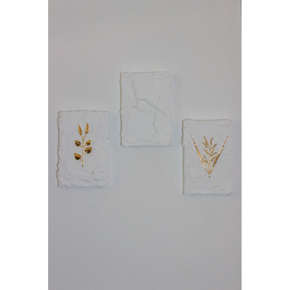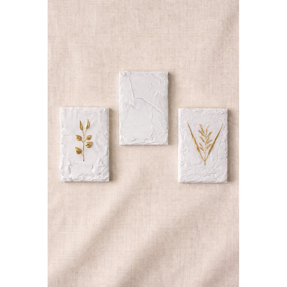 Um kit de peças que celebra a natureza em um verdadeiro tesouro, cada quadro é texturizado com gesso em branco no fundo, o verdadeiro destaque estão nas figuras aplicadas banhadas a ouro, transmitindo o luxo e brilho para a combinação, o ramo de pimenta é o símbolo de proteção e força, unindo com o trigo que nos traz o significado de prosperidade e abundancia, a união perfeita em significado e tons com uma estética minimalista e elegante, o trio pode ser exposto junto ou separado, entregando poesia e beleza para ambientes.