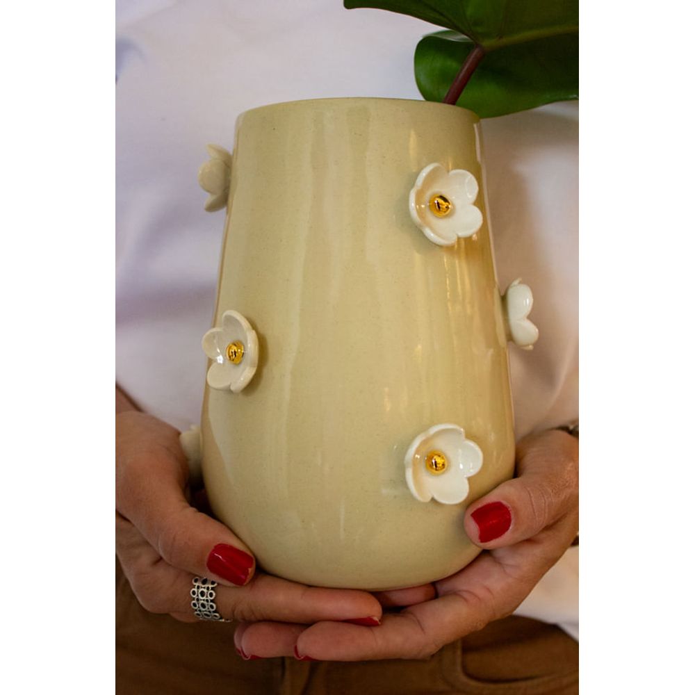 Vaso decorativo feito de cerâmica em um processo 100% artesanal, moldado e pintado à mão. Apaixonada por texturas, formas orgânicas e pequenos gestos de poesia, Marô Antunes nos apresenta o Vaso Nina Flor — uma peça com acabamento nude suave e aplicações delicadas de flores brancas com miolo dourado. Um encontro entre a leveza e o afeto que transforma qualquer canto da casa em cenário de encantamento.