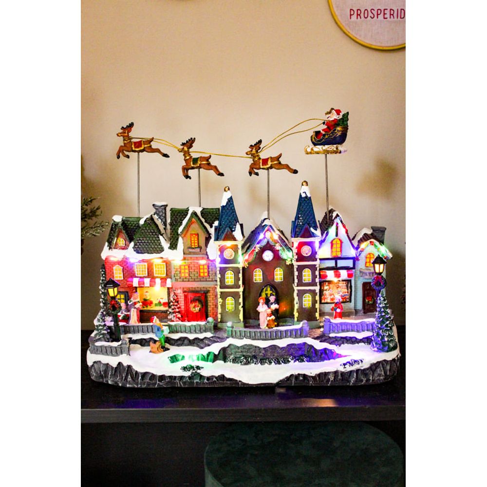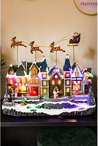 A vila decorativa casa e trenó grande, é uma peça muito atraente contendo um cenário clássico de natal com figuras que se divertem na neve e observam as luzes de natal da vila em uma noite iluminada, ao acender a vila se transforma em um verdadeiro encanto, composta por renas que sobrevoam e se movem por cima da vila sobre o treno com o papai noel, um ambiente coberto de neve e alegria, você também pode ajustar para ouvir o som que a vila transmite ou deixar apenas em movimento sem o som. Uma peça que revela o aconchego e harmonia de encanto que o natal transmite.